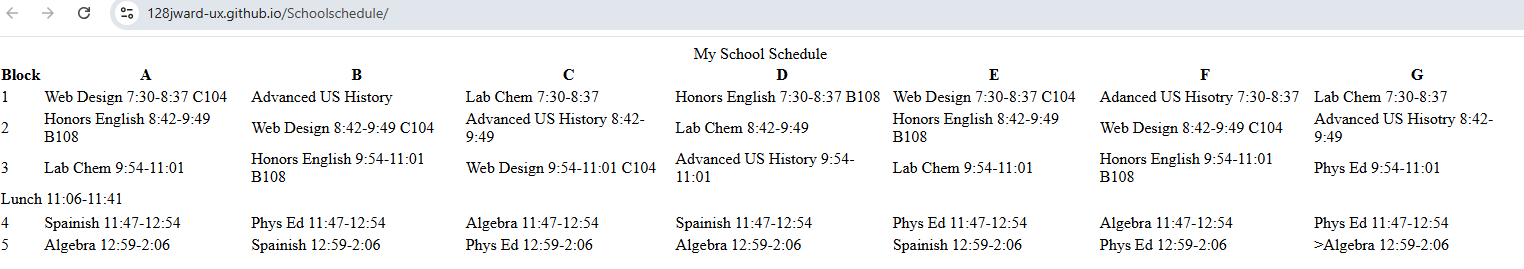 This picture shows my school schedule that I made using elements such as the table element |